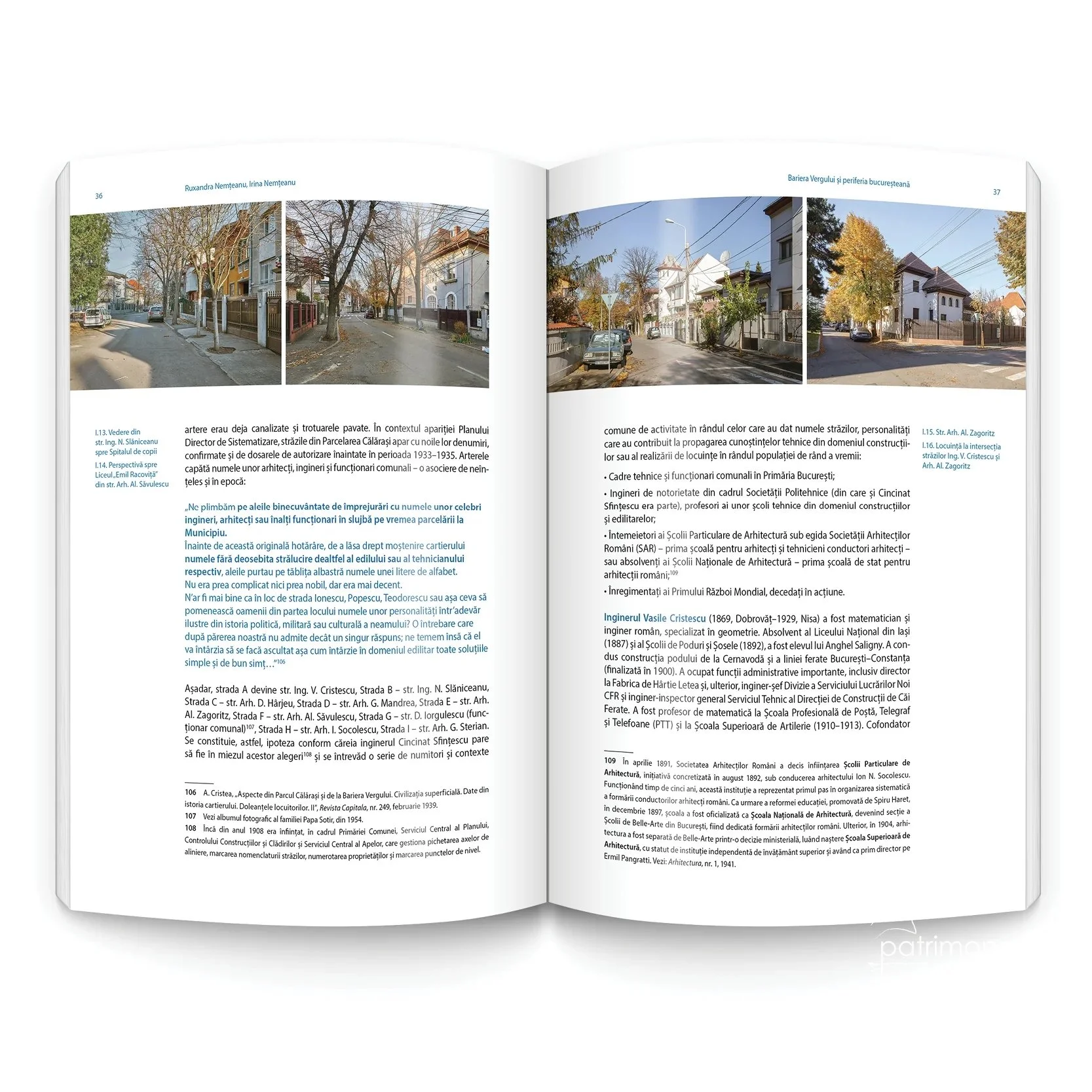 Acest parcurs sugerează atmosfera timpurilor de edificare ale parcelării, precum și o legătură intrinsecă între oameni și clădiri, urmărită minuțios. Să construiești astăzi înseamnă să continui povestea locului, fără să-i rupi firul. Pentru acest lucru, este nevoie de afecțiune pentru loc și responsabilitate. Din această dualitate se naște grija autentică pentru patrimoniul construit, scopul acestui volum.”